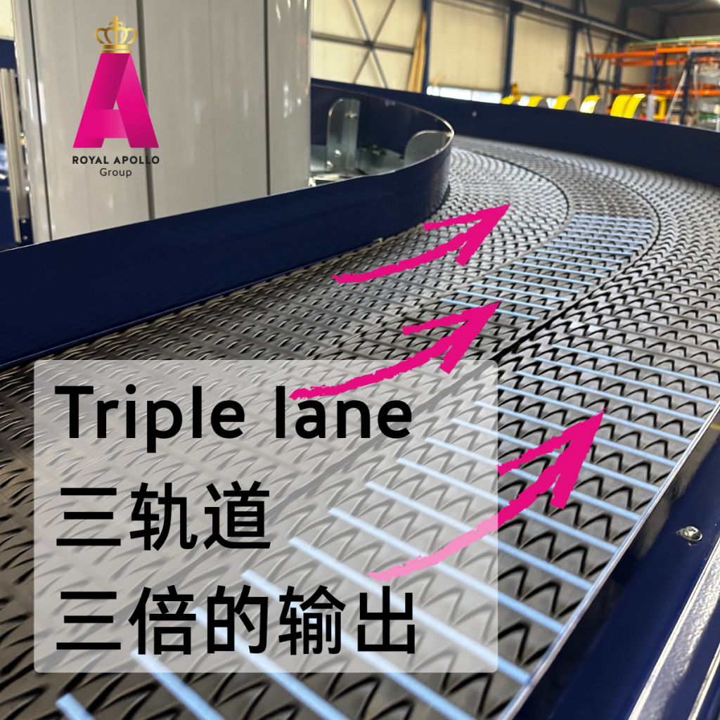 Apollo常规的螺旋输送机可以设计为单列式或双列式轨道,而本次项目的窄列式螺旋输送机为特殊定制的三列式轨道,并同时配备Movex过渡段转移,以满足客户在产能与现场布局上的特殊要求。